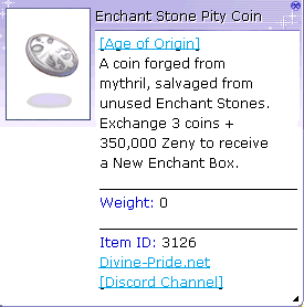 You'll need <mark style="color:$warning;">Enchant Stone Pity Coin</mark> and a fee of <mark style="color:yellow;">350.000 Zeny</mark>, then you can choose which Enchant Box you want.
